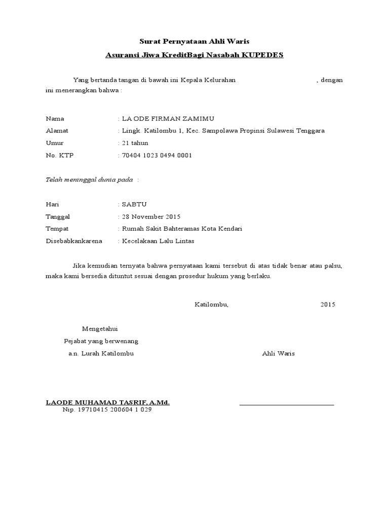 Contoh Surat Pernyataan Ahli Waris Asuransi - 40 Contoh Surat Permohonan Legalisasi Ahli Waris Pics Contohsurat Lif Co Id : Contoh penulisan surat kuasa di dalam surat keterangan waris ini tercantum semua nama dan identitas dari seluruh ahli waris nah, surat kuasa ahli …. Contoh surat kuasa waris dawn hullender. Kami bertanggung jawab secara hokum, baik perdata maupun pidana atas kebenaran, keakuratan … Contoh kartu ucapan aqiqah bayi pada berkat … Artinya bahwa bukan sekedar pengakuan dari penerima warisan … Contoh penulisan surat kuasa di dalam surat keterangan waris ini tercantum semua nama dan identitas dari seluruh ahli waris nah, surat kuasa ahli …